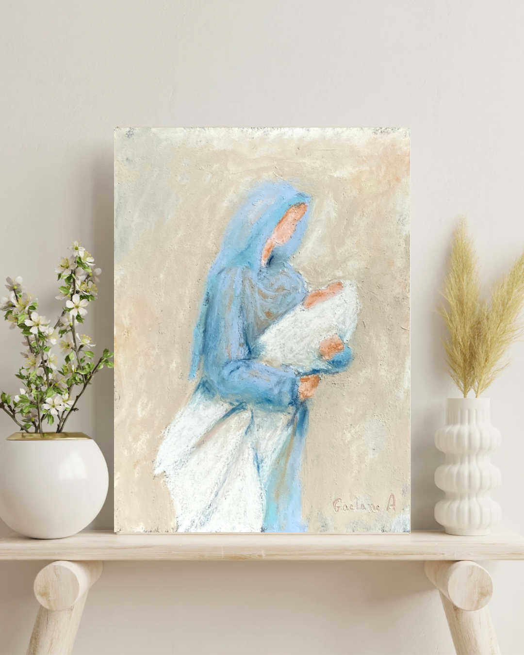 You can choose between the mini-canvas (perfect for a prayer corner) or a larger size canvas. Both are cute gifts for a baptism or baby shower or any other occasion.
